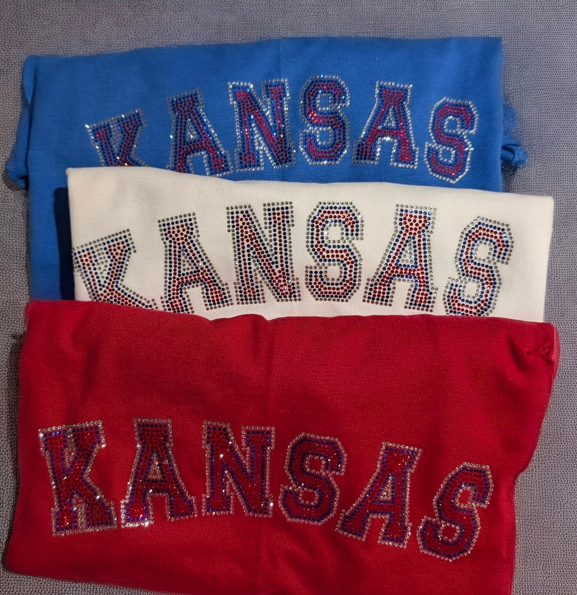 Show your school spirit in style with this sparkling rhinestone shirt! Featuring “KANSAS” in bold red, blue, and crystal rhinestones, it’s perfect for game days, school events, or everyday wear. A fun and spirited choice that also makes a great gift for any Kansas fan!
