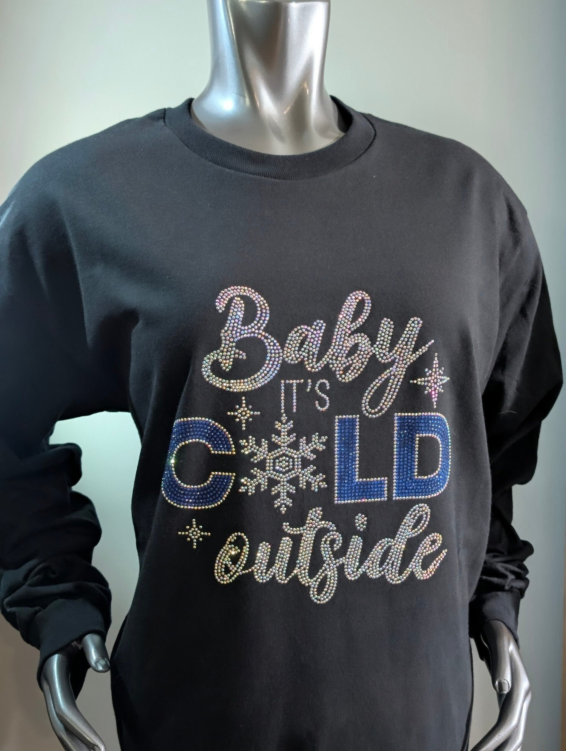 Wrap yourself in cozy comfort and holiday sparkle with this must-have winter top. Featuring the classic phrase "Baby It's Cold Outside" spelled out in gorgeous, shimmering rhinestones, this apparel is the perfect way to feel festive while staying completely comfortable. It's the ideal piece for holiday parties, cozy movie nights, or sipping hot cocoa by the fire.